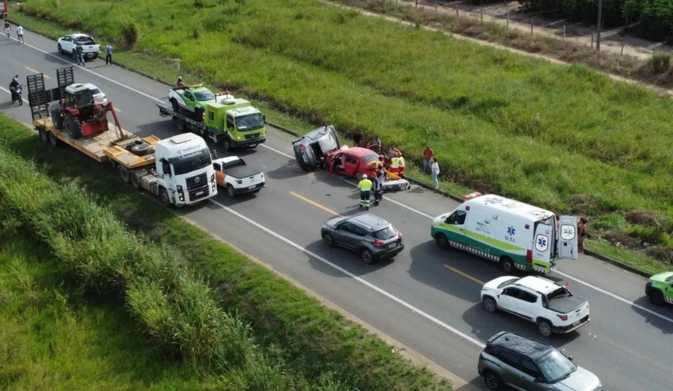 Um grave acidente envolvendo um caminhão e dois carros de passeio deixou duas pessoas mortas na tarde desta sexta-feira (17), na BR-101, em Aracruz. A colisão foi registrada às 14h24, no quilômetro 181,7 da rodovia, segundo o Centro de Controle Operacional da Ecovias Capixaba.